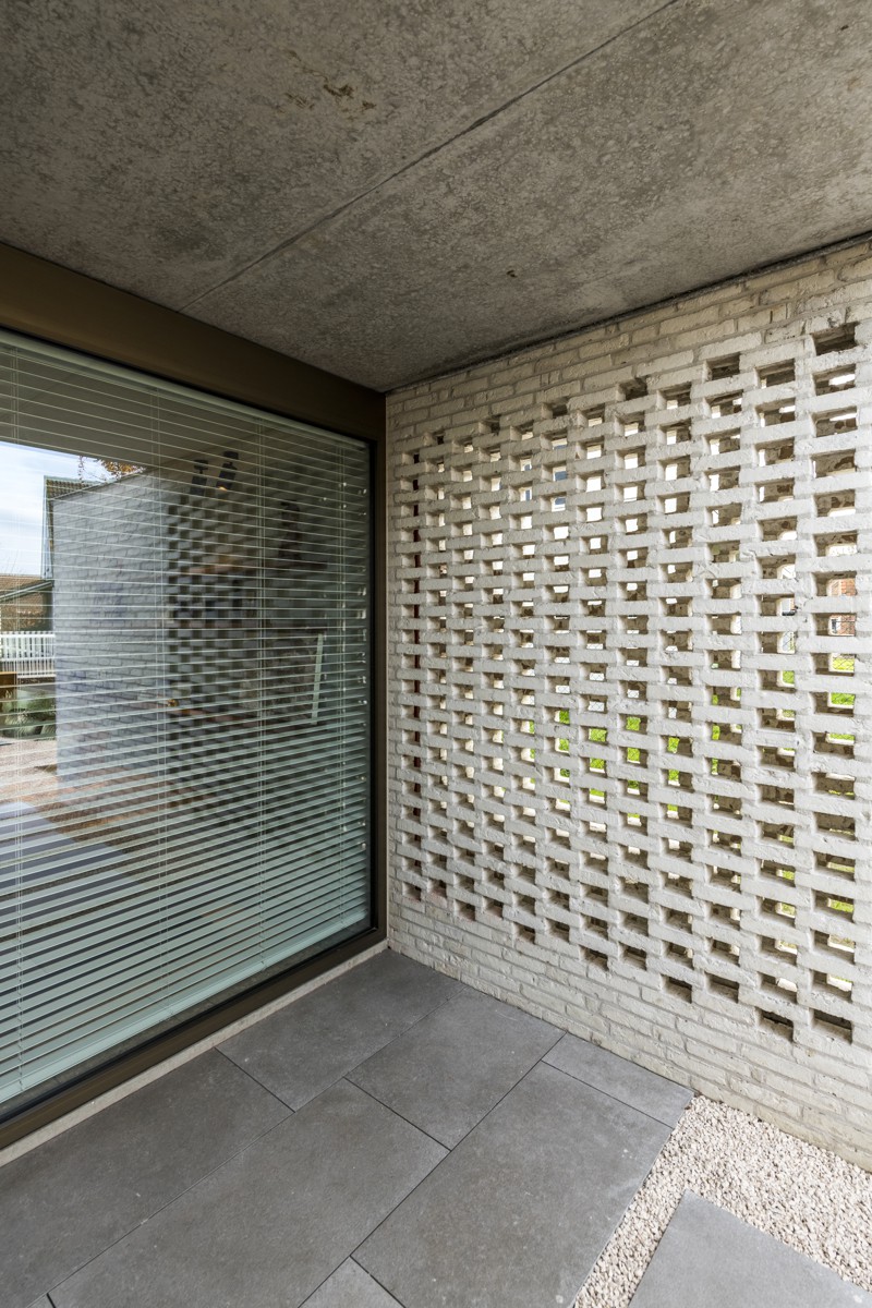Een subtiele knik in de kopse gevel geeft bestaansrecht aan een omsloten inkompatio. Deze fungeert als lter tussen straat & leefruimte. Eens binnen wordt duidelijk wat er achter het prominente blokraam